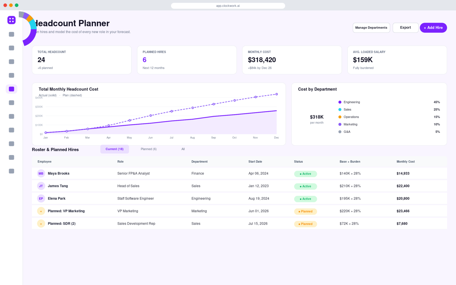 With Clockwork's Headcount Planner, you can forecast and manage headcount all the way down to an individual employee level. Clockwork also integrates with all the major payroll provides to automatically build your entire headcount plan in minutes for you to then customize when needed.